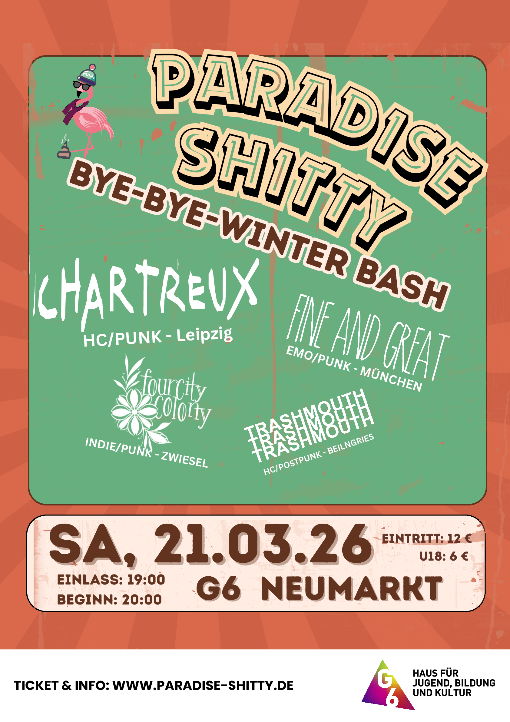 Am Samstag, 21. März findet um 20:00 Uhr Paradise Shitty mit den Bands "Chartreux", "Fine and Great", "Fourcity Colony" und "Trashmouth" im G6 statt.